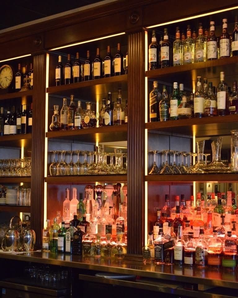 Bar with liquor bottles on shelves and decorative brass sculptures on the wooden counter.