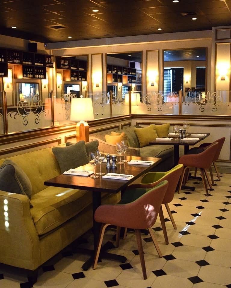 Restaurant interior with tables set for dining, shelves of wine, mirrors, and floral centerpieces.