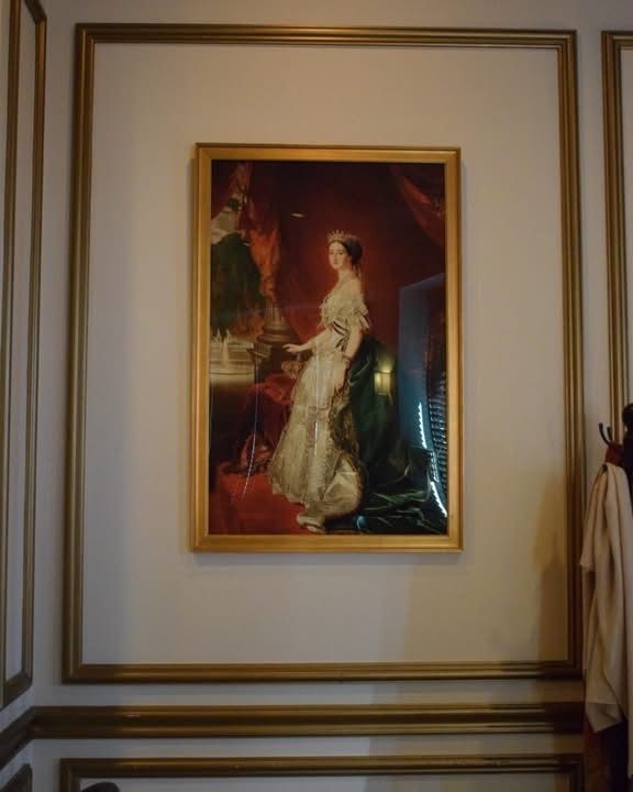 Woman reclining on a couch, looking to the side with a smile, under a framed painting on a gold-trimmed wall.