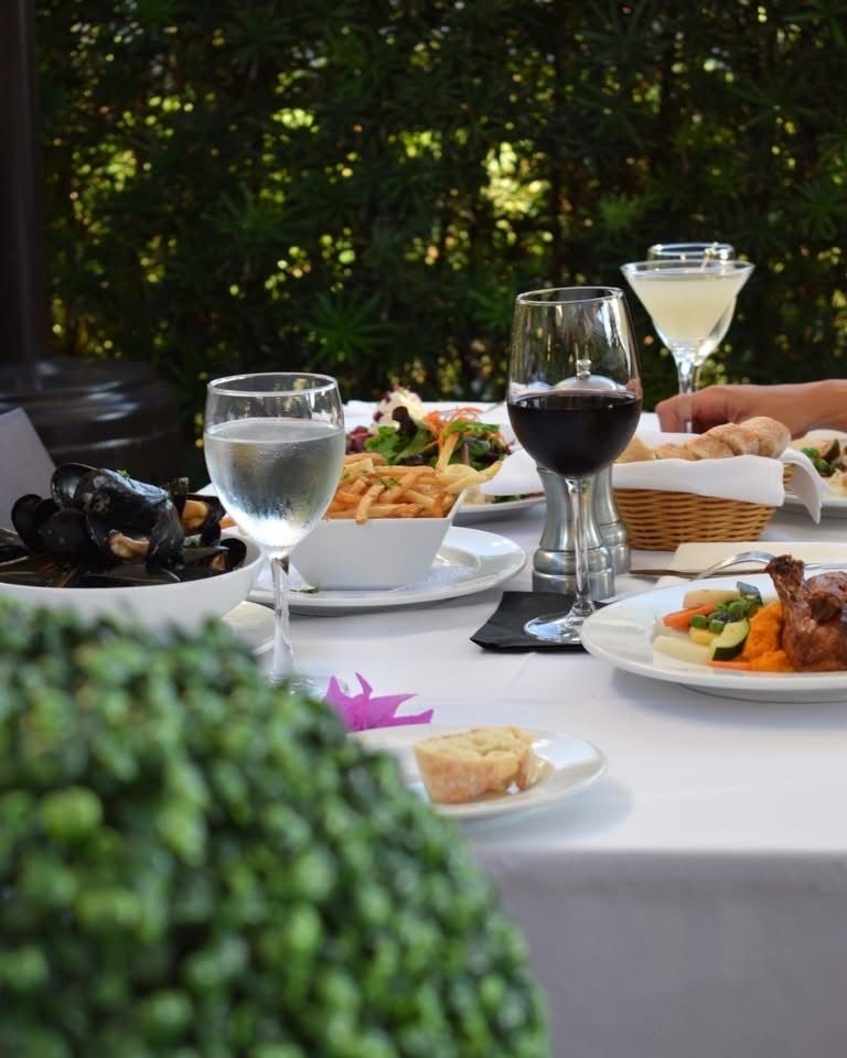 Outdoor dining area with tables set with white tablecloths, surrounded by trees and brick patio.